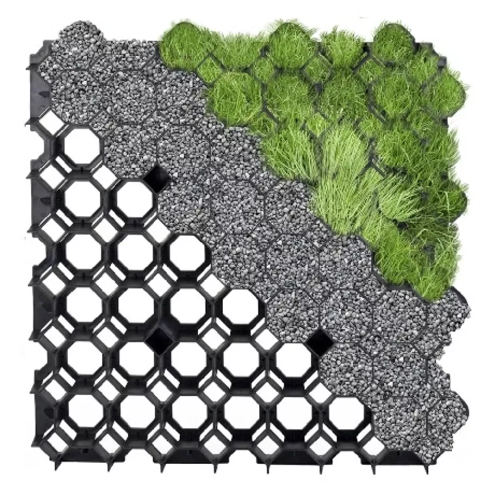 Szintezze ki a talajt, terítsen geotextíliát, majd helyezze le a rácsokat, töltse fel földdel, szórjon fűmagot, és gondozza a felületet.