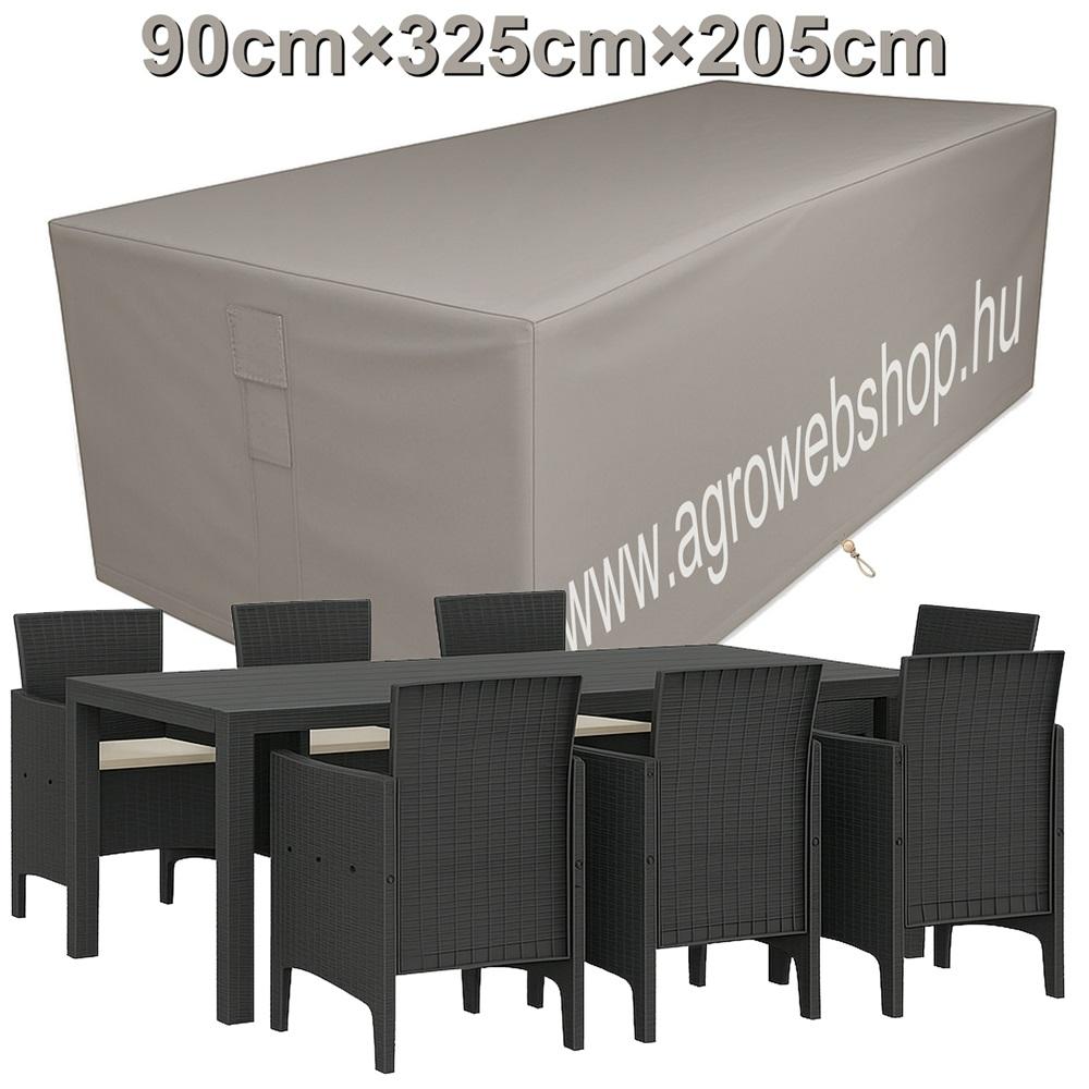 Ez a kerti bútortakaró ponyva UV-álló PE anyagból készült, **90×325×205 cm** méretben, ideális nagy asztal szettek takarásához. A takaró ponyva taupe színben kapható, és peremben húzómadzaggal ellátott, hogy feszesen illeszkedjen és ne csússzon el szeles időben sem.