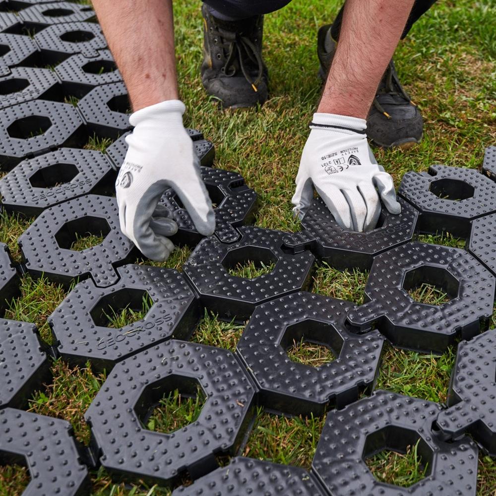 A Geocross egyik kiemelkedő előnye a hagyományos gyeprácsokkal szemben, hogy nem igényel komoly előkészítést. Nincs szükség szikkasztó kavicsrétegre vagy bonyolult alapozásra. A telepítés rendkívül egyszerű: a rácsokat le kell helyezni, egymáshoz csatlakoztatni, majd döngöléssel a talajba rögzíteni. Ezután azonnal használható felületet kapunk. A rács szerkezete biztosítja, hogy a talaj a helyén maradjon, nem csúszik el és nem süllyed meg. A cellák összetartják a talajt, így akár rézsűn vagy lejtős területen is hatékony megoldást nyújtanak.