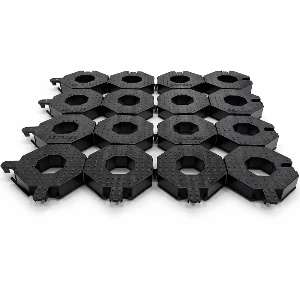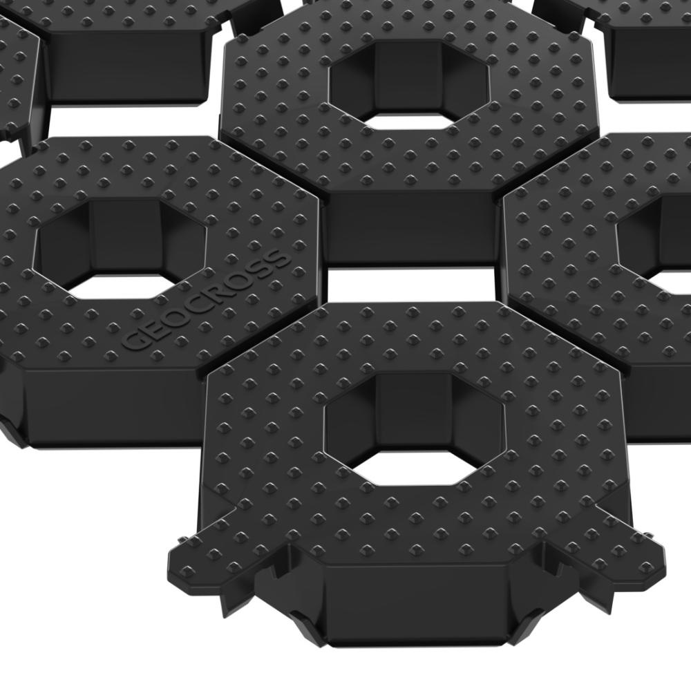 A Geocross alapanyaga a Gralene HD, amely egy nagy sűrűségű polietilén (HDPE) alapú, ipari minőségű műanyag. Ez az anyag kiemelkedő mechanikai tulajdonságokkal rendelkezik: nagy szilárdságú, ütésálló, ugyanakkor rugalmas, így kiválóan ellenáll a folyamatos terhelésnek és a környezeti hatásoknak. A Gralene HD alapanyag UV-stabilizált, így hosszú távon is megőrzi szerkezeti stabilitását, nem repedezik és nem válik rideggé még intenzív napsugárzás esetén sem. Emellett ellenáll a fagynak, a nedvességnek és a korróziónak, így kültéri felhasználásra ideális választás. A felhasznált alapanyag gyakran újrahasznosított polietilénből készül, amely nemcsak tartósságot, hanem környezettudatos megoldást is biztosít. Ennek köszönhetően a Geocross nemcsak nagy teherbírású és hosszú élettartamú, hanem fenntartható burkolati rendszer is.