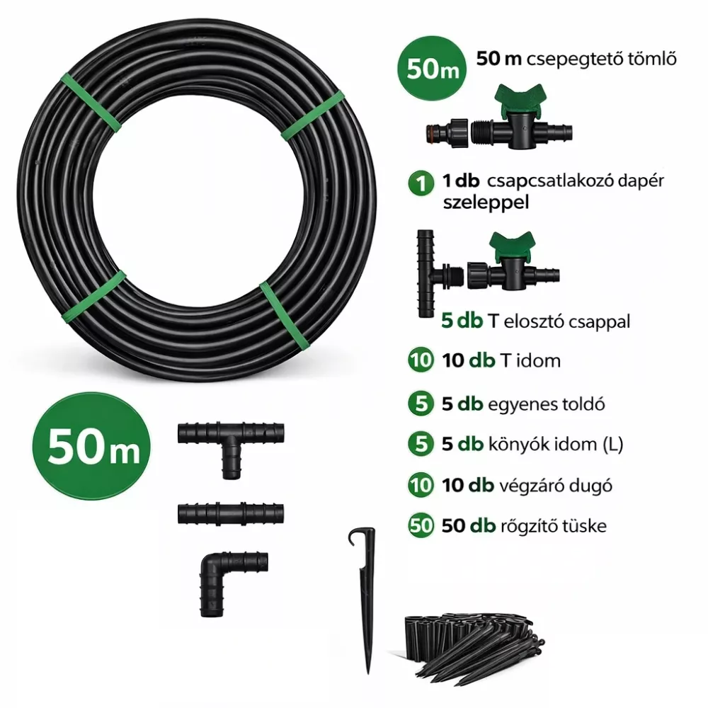 A 50 m-es rendszer közepes és nagyobb kertek öntözésére is alkalmas, elrendezéstől függően.